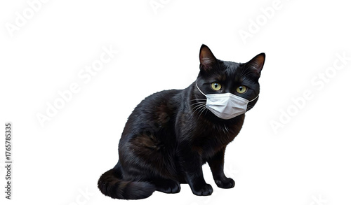 © Elizabeth_Art, Obraz premium a black cat with striking yellow eyes sits attentively while wearing a disposable surgical mask.