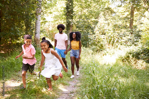 © Monkey Business, Fototapeta premium A black couple and their two kids walking in a forest