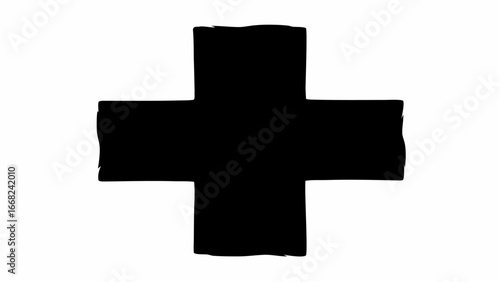 Fototapeta premium A black cross shape with rough edges against a white background in a simple...