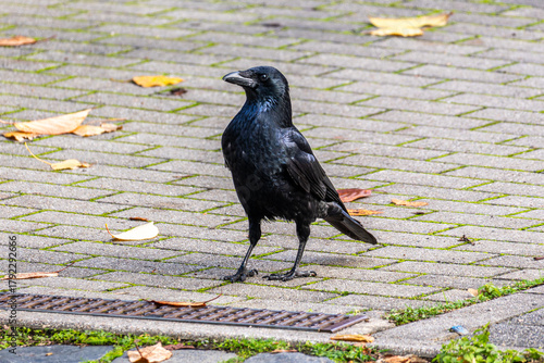 © PIXAS, Naklejka premium A black crow standing on cobblestones in autumn sunlight, its glossy feathers shimmering beautifully in the warm natural light.