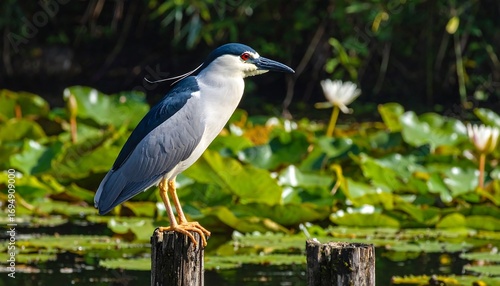 © Harda, Naklejka premium A black-crowned night heron perches gracefully on a weathered wooden post amidst a tranquil pond, surrounded by lush lily pads and vibrant greenery.