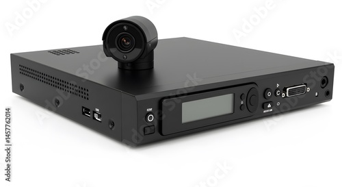 © Handrey, Obraz premium A black device with a camera on top and various ports and buttons on a white background studio shot