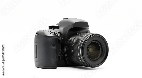 © Sherafgan, Naklejka premium A black digital slr camera with a lens attached is positioned on a clean white background surface ai generated
