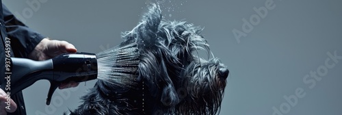 © Iswanto, Fototapeta premium A black dog gets sprayed with water from a nozzle.