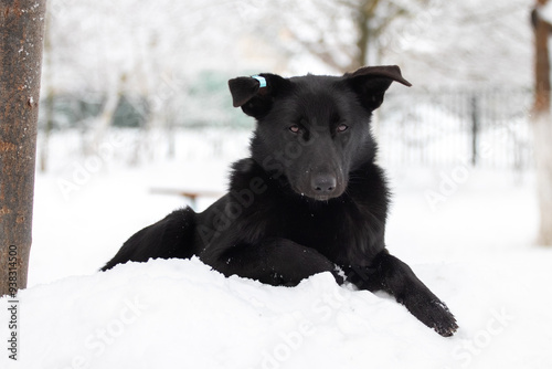 Naklejka premium A black dog lies on a pile of snow in winter