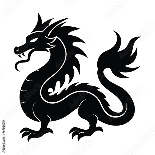 © Sadia, Obraz premium A black dragon with a white background, Dragon Black and White Illustration. isolated on white background