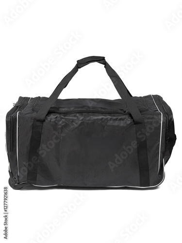 © Isolated On White, Naklejka premium A black duffel bag featuring a sturdy handle on a white background Hockey Equipment Bag