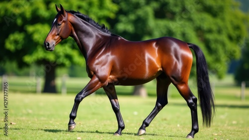 © ArtPro, Obraz premium A black forest chestnut horse walking gracefully on a green field.