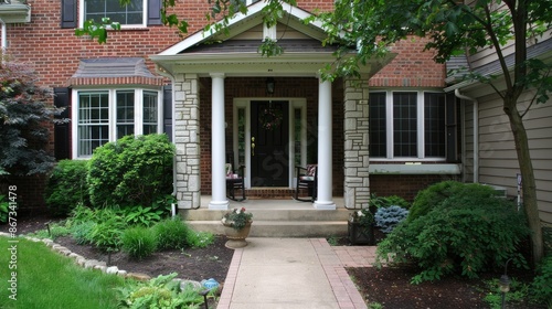 © lililia, Obraz premium A black front door with glass panels is flanked by two stone pillars and potted flowers.