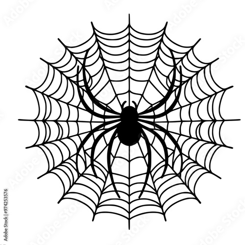 © ANASTASIIA, Fototapeta premium A black graceful spider in the center of a symmetrical web. Linear vector drawing, minimalistic style, black and white.