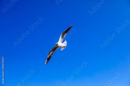 © ABCDstock, Obraz premium A black-headed gull flying in the blue sky.