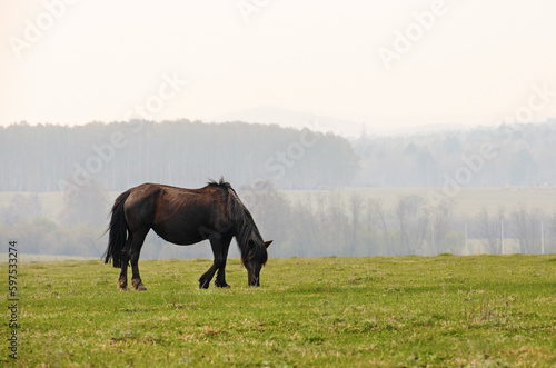 © dvulikaia, Obraz premium A black horse grazes in a meadow and eats grass. Farming concept.