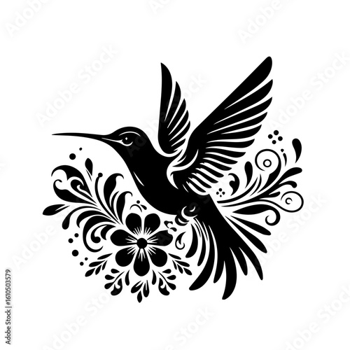 Fototapeta premium A black hummingbird in flight with ornate floral elements