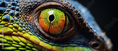 © Ilgun, Fototapeta premium A black iguana with green spots perches on a man's left shoulder while he dons a yellow t-shirt against a black backdrop, creating a picturesque copy space image.
