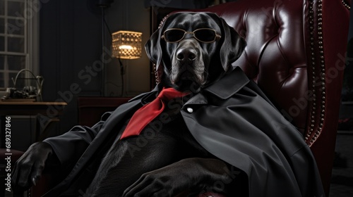 © olegganko, Obraz premium a black lab with her cape and sunglasses sitting in a chair,