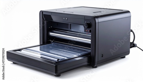 Fototapeta premium A black laminating machine with its input tray extended, showcasing its...