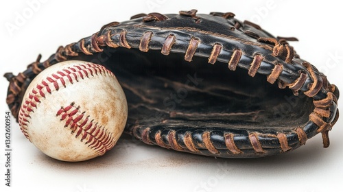 © Boonnam Burart, Fototapeta premium A black leather catcher's mitt gripping a bright white baseball, set against a seamless white background
