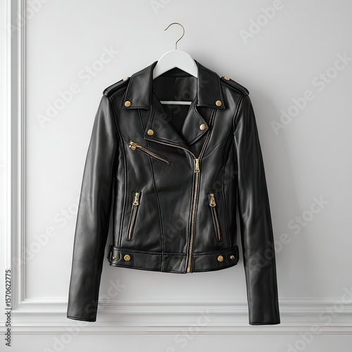 Naklejka premium A black leather moto jacket with gold hardware hangs on a white hanger...