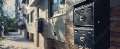 © Helois, Obraz premium A black mailbox with three compartments is mounted on the side of a brick building.