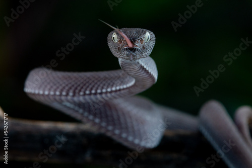 © Ralfa Padantya, Obraz premium A black male mangrove pit viper snake Trimeresurus purpureomaculatus on attacking position with dark bokeh background
