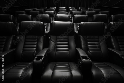 Fototapeta premium A black movie theater with rows of black leather chairs
