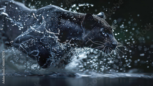 © MP_Artworks, Obraz premium A black panther rushing through a black background and water.