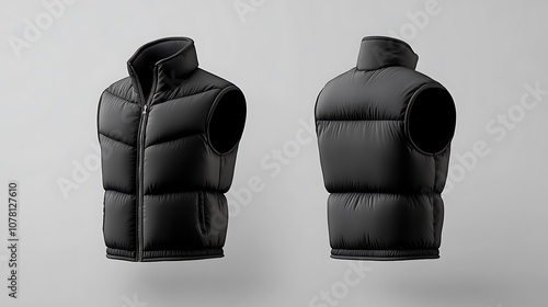 Naklejka premium A black puffer vest displayed from front and back views, showcasing its design and functionality.