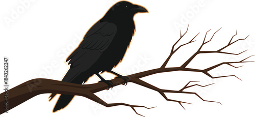 © mrvect02, Obraz premium A black raven perched on a bare branch against an orange backdrop on transparent background