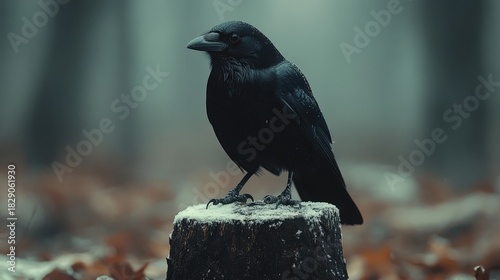 © Miramiska, Fototapeta premium A black raven sits on a snow-covered stump, gazing off to the side in a serene forest setting. This image conveys a mood of quiet reflection and the beauty of untouched nature.