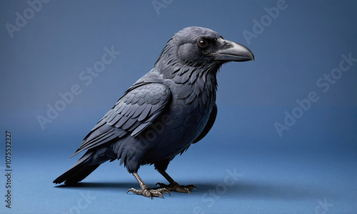 © Miklos, Fototapeta premium A black raven stands on a blue background, looking to its right