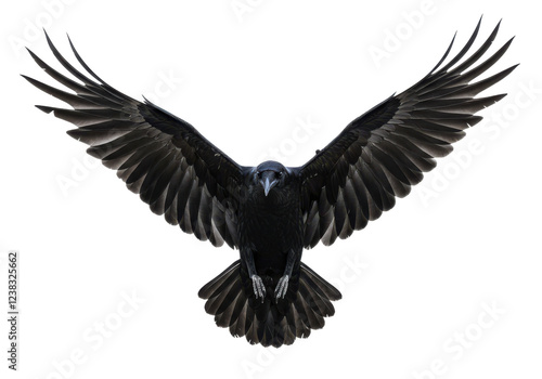 © Vooglo.com, Fototapeta premium A black raven with wings fully spread, captured mid-flight, isolated on white background