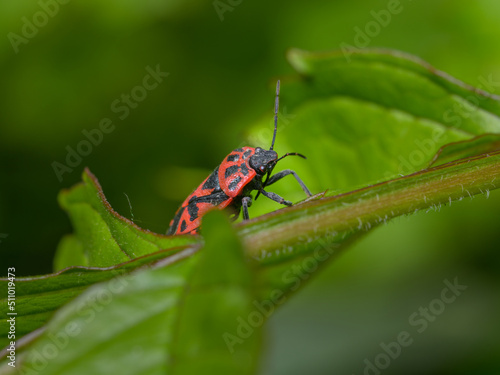 Fototapeta premium A black red cabbage bug sitting on a leaf