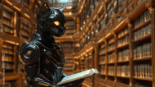 © Enggal Pitoyo, Fototapeta premium A black robotic cat reading a book in a library.