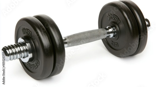 © Suphawan, Fototapeta premium A black rubber-coated dumbbell with ergonomic handle, isolated on a bright white background, showcasing its compact and durable build.