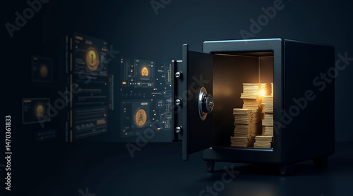 Fototapeta premium A black safe slightly open with stacks of cash and gold shining inside, surrounded by digital security interface projections.