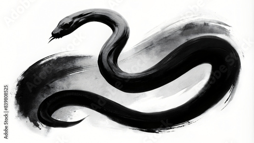 Naklejka premium A black serpent illustration, with a focus on the contrast between the black creature and the white background in brush painting style