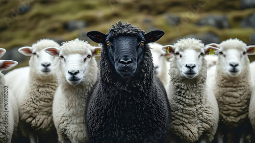 Fototapeta premium A black sheep stands out among a group of white sheep.
