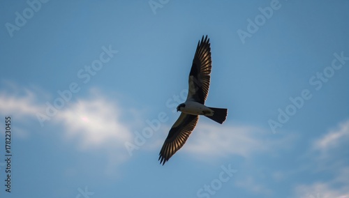 Fototapeta premium A Black-shouldered Kite in silhouette hovering during dawn, focused hunting behavior