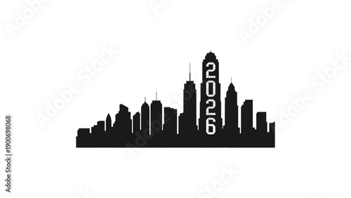 Fototapeta premium A black silhouette of a city skyline with a futuristic 2026 tower