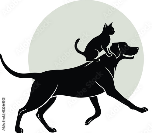 © Zayan, Fototapeta premium A black silhouette of a dog running with a cat riding on its back against a gray circular background