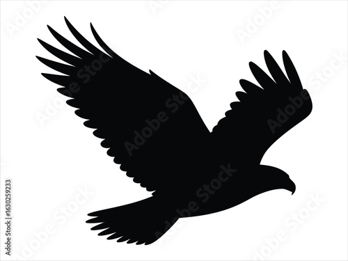 © Farid, Obraz premium A black silhouette of a flying eagle or hawk, depicted as a powerful vector icon isolated on a white background.