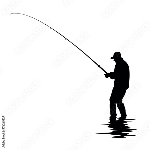 © Big Dream, Obraz premium a black silhouette of a man fishing. He is standing in the water and is holding a fishing rod with both hands. The man is facing towards the right side of the image and appears to be casting his line