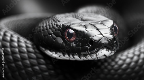 © Pixel Mind, Fototapeta premium A black snake displays its textured scales and vivid red eyes while coiled in the wild