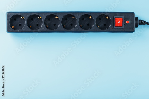 Fototapeta premium A black surge protector with portable sockets and a red button on a blue...
