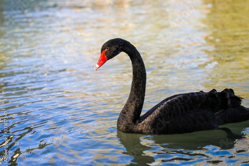 Fototapeta premium A black swan moored in the blue lake . A black swan on blue water.