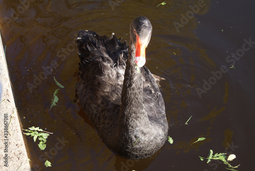 Fototapeta premium A black swan swims in the lake, a beautiful bird.