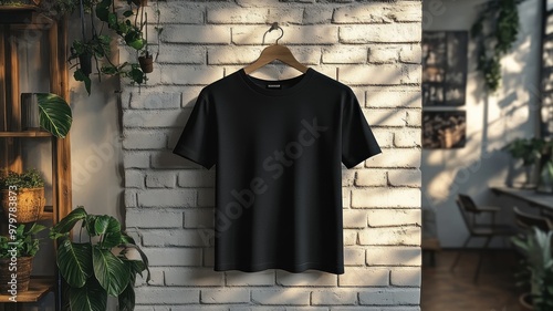 Naklejka premium A black t-shirt hanging against a white brick wall, creating a striking...