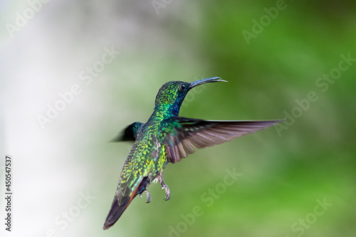 © Chelsea Sampson, Obraz premium A Black-throated Mango hummingbird (Anthracothorax nigricollis) flying away from camera with a blurred background. Bird in flight. Tropical bird.