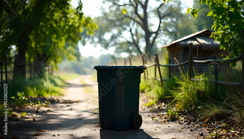 © Nazuna, Fototapeta premium A black trash can on a dirt path surrounded by trees and foliage, with sunlight filtering through the leaves