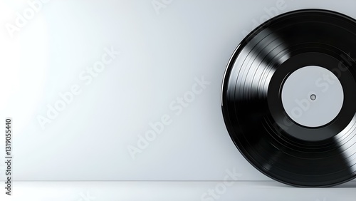 © Anastasiia, Obraz premium A black vinyl record leaning against a plain white wall, showcasing its glossy surface and circular shape. Concept Black Vinyl Record, Glossy Surface, Circular Shape, Minimalistic Aesthetic, Wall Art
